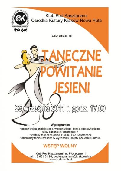 W Kocielnikach (Klub Pod Kasztanami Orodka Kultury Kraków-Nowa Huta) jesień zostanie przywitana tanecznie. Podczas imprezy odbędzie się: pokaz walca angielskiego i wiedeńskiego, tanga argentyńskiego a także prezentacja tańców latynoamerykańskich: salsy kubańskiej i mambo w stylu New York. Dodatkowo Dorota Szelenik - Burnus zaprezentuje taniec brzucha.