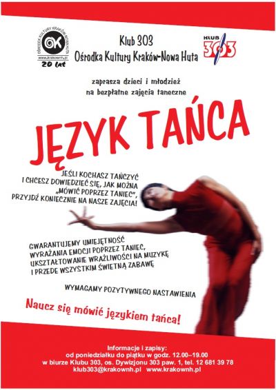 Klub 303 Oœrodka Kultury Kraków-Nowa Huta (os. Dywizjonu 303) zaprasza dzieci od 9 lat oraz młodzież szkół gimnazjalnych i ponadgimnazjalnych na warsztaty taneczne Język tańca.
