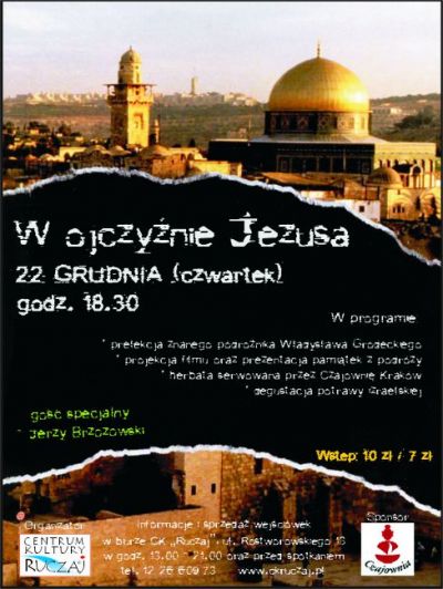 W czwartek, 22 grudnia o godz. 18:30 zapraszamy do Centrum Kultury "Ruczaj" na spotkanie Klubu Podróżnika. Temat najbliższego spotkania to "W ojczynie Jezusa", a poprowadzi je Władysław Grodecki, który zaprezentuje filmy, zdjęcia i pamištki ze swojej podróży do Izraela. Gociem specjalnym będzie Jerzy Brzozowski. Dodatkowo, wszyscy uczestnicy będš mogli spróbować tradycyjnej, izraelskiej potrawy oraz herbaty serwowanej przez Czajownię Kraków.
