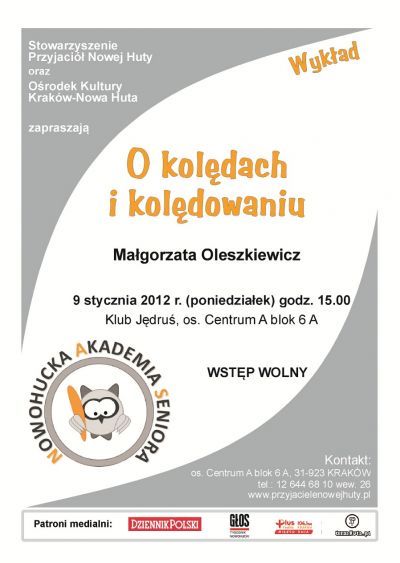 Nowohucka Akademia Seniora zaprasza na pierwszy w 2012 roku wykład, który odbędzie się 9 stycznia (poniedziałek) o godz. 15.00 w Klubie Jędru Orodka Kultury Kraków-Nowa Huta (os. Centrum A 6a).