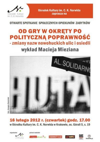 W ramach otwartego spotkanie społecznych opiekunów zabytków i miłoœników historii zapraszamy na otwarty wykład historyka Macieja Mieziana poœwięcony zmianom nazw nowohuckich ulic i osiedli.