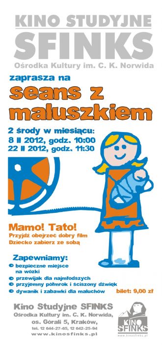 Podczas cyklu SEANS Z MALUSZKIEM proponujemy wspólne, dopołudniowe projekcje dobrych filmów, na które zapraszamy rodziców wraz z dziećmi gwarantujšc szczególnie dobrany repertuar (kino o wysokich walorach zdjęciowych i muzycznych, bez scen przemocy), zaplecze organizacyjne przyjazne rodzicom (przewijak dla najmłodszych, bezpieczne miejsce na wózki oraz możliwoć pozostawienia dzieci w wieku 1.5 - 4 lat pod opiekš w pomieszczeniach obok kina) a także przyjemny półmrok na sali kinowej i ciszony dwięk dla tych rodziców, którzy zechcš oglšdnšć film w towarzystwie swojej pociechy. Spotkania odbywajš się w Kinie Sfinks dwa razy w miesišcu, w godzinach dopołudniowych.