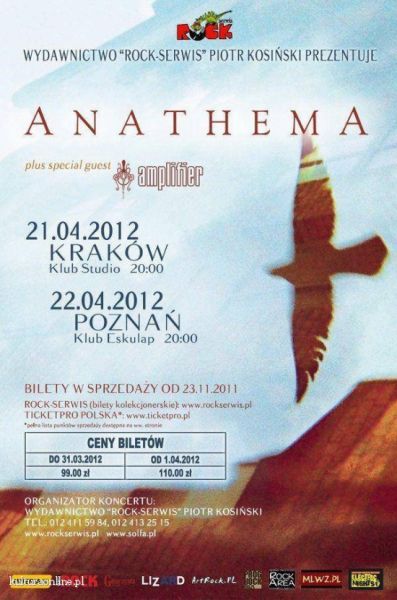 Anathema od wielu lat należy do czołówki brytyjskiego rocka. Jego członkowie zaczynali muzycznš podróż jako pionierzy melodyjnej muzyki spod znaku heavy, by potem przekroczyć granice gatunków i już bez żadnych ograniczeń wzbogacać swoje brzmienie i badać nowe muzyczne terytoria. Na 16 kwietnia 2012 roku grupa zaplanowała premierę swojego najnowszego kršżka. Kilka dni póniej zespół rozpocznie promocyjne tournee, które tradycyjnie nie ominie naszego kraju. Anathema zagra 2-godzinne koncerty 21 kwietnia 2012 w Krakowie w Klubie Studio i 22 kwietnia 2012 w Poznaniu w Klubie Eskulap. Gociem specjalnym zespołu będzie formacja Amplifier.