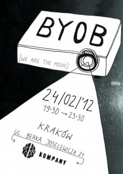 24 lutego 2012 r. zapraszamy na BYOB (Bring Your Own Beamer), czyli na pokaz prac mutlimedialnych, fotografii, animacji i wizualizacji stworzonych przez Was. Pierwsza krakowska edycja imprezy odbędzie się pod hasłem: We are the mosaic. Swojš twórczoć w przestrzeni Kompany będzie mógł zaprezentować każdy, kto przyniesie ze sobš komputer oraz projektor. Kuratorami imprezy sš Jarek Tokarski oraz Maria Regucka. O atrakcje muzyczne wieczoru zadba Justice Beamer (uk bass / future garage).
