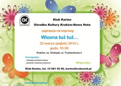 Klub Karino Oœrodka Kultury Kraków-Nowa Huta (ul. Truskawkowa 4) zaprasza 22 marca (czwartek) 2012 r. o godz. 15.00 na imprezę z okazji powitania wiosny, którš przygotujš przedszkolaki uczęszczajšce na zajęcia plastyczne i dzieci z kółka teatralnego.
