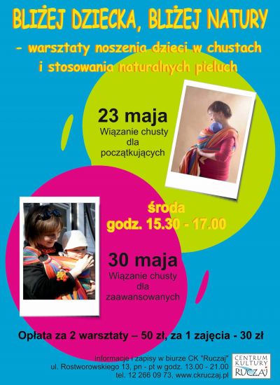 Cykl czterech warsztatów propagujšcych bliskoć i naturalne podejcie do opieki nad dzieckiem: noszenie w chustach/ nosidłach (jako powrót do korzeni a nie nowš modę) i stosowanie pieluch wielorazowych jako zdrowszych dla dziecka, tańszych i bardziej ekologicznych.