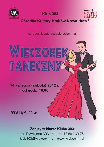 Klub 303 Orodka Kultury Krakw-Nowa Huta (os. Dywizjonu 303) zaprasza 14 kwietnia 2012 r. (sobota) o godz. 18.00 na wieczorek taneczny przy muzyce mechanicznej.