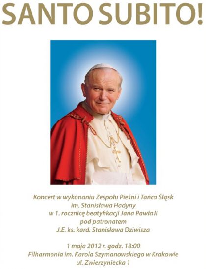 W ubiegłym roku roku wszyscy przeżywalimy radosne chwile wyniesienia na ołtarze Sługi Bożego Jana Pawła II. Instytut Dialogu Międzykulturowego im. Jana Pawła II w sposób szczególny chce uczcić tš rocznicę i pochylić się nad dziedzictwem jakie nam pozostawił Jan Paweł II. Dla upamiętnienia tego szczególnego dnia, Instytut organizuje wyjštkowy koncert Santo Subito! Tańce Polskie Zespołu Pieni i Tańca lšsk im. Stanisława Hadyny. lšsk to jeden z największych polskich zespołów folklorystycznych, założony 1 lipca 1953 przez Stanisława Hadynę oraz Elwirę Kamińskš. Zespół poczštkowo prezentował folklor lšski, w szczególnoci tańce i pieni odnoszšce się do Górnego lšska, ziemi cieszyńskiej i Beskidów. Póniej wykonywał także inne polskie pieni i tańce, w tym zwišzane z folklorem małopolskim czy kujawskim. Obecnie w repertuarze zespołu znajdujš się również pieni i tańce wszystkich polskich regionów, a nawet opery, oratoria i muzyka sakralna.