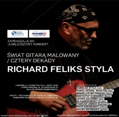 W niedzielę 22 kwietnia o godz. 18.00 w Studiu im. Romany Bobrowskiej (Radio Kraków) odbędzie się jubileuszowy koncert Ryszarda Styły wiat gitarš malowany/cztery dekady. Muzyk zagra swoje najbardziej znane kompozycje prezentowane już od ponad 30 lat na krakowskiej scenie jazzowej. Finał koncertu prawdziwa wisienka na torcie: wykonanie premierowego utworu Ryszarda Styły zagrajš zaproszeni muzycy: Karolina Styła (popularna wokalistka to prywatnie córka gitarzysty) Paweł Dróżdż, Bogusław Mietnikowski, Krzysztof cierański, Leszek Szczerba, Sławomir Berny, Tadeusz Leniak, Piotr Kosieradzki i Maciej Hrybowicz.