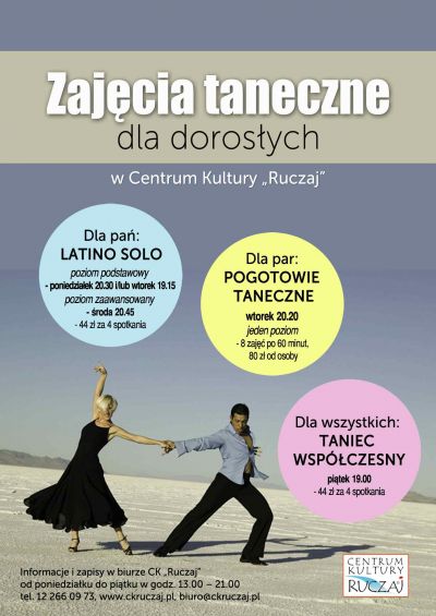 Zapisy w biurze CK "Ruczaj", ul. Rostworowskiego 13, od pn-pt w godz. 13:00-21:00, tel. 12 266 09 73 lub mailowo: biuro@ckruczaj.pl.