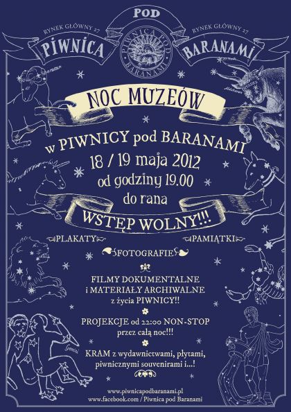 Legendarna Piwnica pod Baranami, ju kolejny raz otwiera swoje drzwi podczas Nocy Muzew! Nasi gocie bd mogli przez ca noc oglda filmy, opowiadajce o tym miejscu, obejrze wystaw pamitek, a nawet jedn z nich zakupi! Zapraszamy od 22. Wstp wolny!