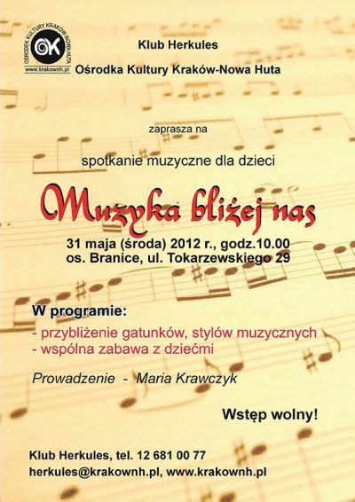 Klub Herkules Oœrodka Kultury Kraków-Nowa Huta (ul. Tokarzewskiego 29) zaprasza na kolejne spotkanie z zakresu edukacji muzycznej dla dzieci, które odbędzie się 31 maja 2012 r. (czwartek) o godz. 10.00.