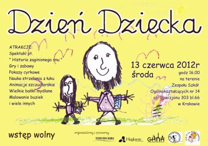 umiejętnociami z innymi, postanowilimy zorganizować Dzień Dziecka dla najmłodszych, którzy spędzajš czas na nowohuckich podwórkach. Pochodzimy z różnych grup artystycznych min. Teatr Za Jeden Umiech, Teatr Inna Bajka, Grupa Happenerska Nowa Huta, Kuglarze (http://www.kuglarze.com.pl ), Krzysztof Skompiński - wojownik mongolski oraz Małopolska Zgraja Sarmacka.