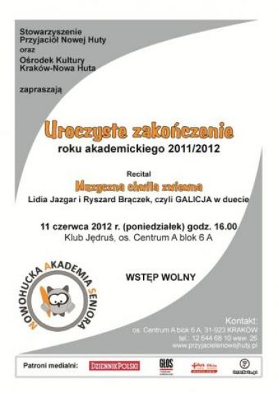 Uroczyste zakoczenie roku akademickiego 2011/2012 w Nowohuckiej Akademii Seniora. Z tej okazji organizatorzy: Stowarzyszenie Przyjaci Nowej Huty oraz Orodek Kultury Krakw-Nowa Huta, przygotowali dla wszystkich suchaczy wyjtkow niespodziank wystp krakowskiej artystki Lidii Jazgar w duecie z Ryszardem Brczek. W programie take wrczenie dyplomw za uczestnictwo w mijajcym roku oraz nagrody dla najaktywniejszych suchaczy.