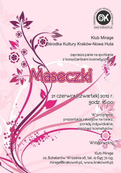 Klub Mirage Oœrodka Kultury Kraków-Nowa Huta (os. Bohaterów Wrzeœnia 26) zaprasza 21 czerwca 2012 r. (czwartek) o godz. 16.00 na kolejne spotkanie z konsultantkami kosmetycznymi.