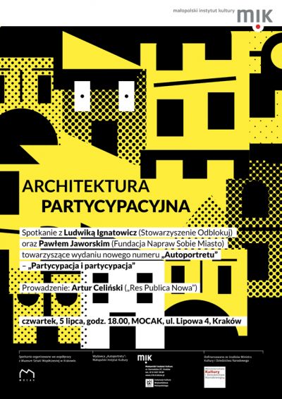 Małopolski Instytut Kultury zaprasza na spotkanie poœwięcone architekturze partycypacyjnej, które odbędzie się 5 lipca 2012 r. w krakowskim MOCAKU. Spotkanie poprowadzi Artur Celiński („Res Publica Nowa”). Do udziału w rozmowie zaproszono Ludwikę Ignatowicz ze Stowarzyszenia „Odblokuj”, która będzie się dzielić doœwiadczeniami z praktycznej realizacji postulatu włšczania mieszkańców w proces projektowania, oraz Pawła Jaworskiego, teoretyka i praktyka uczestnictwa, członka Fundacji Napraw Sobie Miasto. Uczestnicy spotkania będš rozmawiać o tym, w jaki sposób mieszkańcy mogš czy powinni być włšczani w obręb procesu projektowania na kolejnych jego etapach. Będš się także zastanawiać nad politycznymi i społecznymi implikacjami procesu partycypacyjnego; nad zagrożeniami, jakie może w sobie nieœć opacznie rozumiane uczestnictwo; wreszcie nad konsekwencjami, jakie wynikałyby z realizacji rozmaicie pojmowanych koncepcji partycypacji dla obrazu współczesnych miejskich przestrzeni.