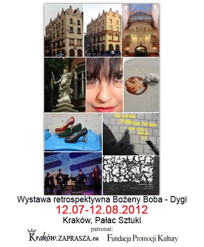 W ramach ekspozycji będzie można zobaczyć realizacje twórcze artystki z różnych dziedzin sztuki: plastyki, muzyki i literatury. Osišgnięcia w ramach sztuki wizualnych reprezentować będzie fotografia artystyczna, montaże plastyczno-literackie, dokumentacje fotograficzne prac konserwatorskich, projekty kostiumów i rekwizytów teatralnych, projekty unikatowych butów oraz ich realizacje, będzie też film o twórczoci artystki przygotowany przez Tadeusza Oratowskiego. Podczas wernisażu będzie miało miejsce prawykonanie partytury graficznej artystki, oraz krótki koncert piosenki poetyckiej w wykonaniu znanej krakowskiej pieniarki Lochu Camelot - Jagi Wrońskiej, która zapiewa teksty Bożeny Boba- Dygi.