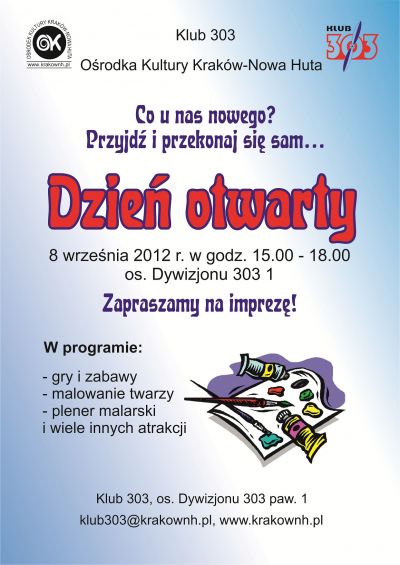 Klub 303 Orodka Kultury Krakw-Nowa Huta (os. Dywizjonu 303 nr 1) zaprasza 8 wrzenia 2012 r. (sobota) w godz. 15.00-18.00 na imprez plenerow, podczas ktrej zaprezentowana zostanie atrakcyjna oferta zaj Klubu 303 na rok kulturalny 2012/2013, z moliwoci dokonania zapisw. W programie take malowanie twarzy, gry i zabawy oraz wiele innych atrakcji. W razie niesprzyjajcej pogody impreza zostanie przeniesiona do sali widowiskowej w Klubie.