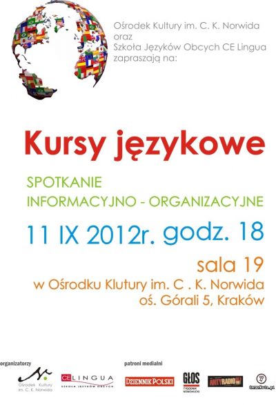 Zapraszamy do Orodka Kultury im. C.K.Norwida, os. Górali 5 spotkanie informacyjno-organizacyjne dla zainteresowanych kursami językowymi w OKN. Kursy prowadzone sš we współpracy ze Szkołš Języków Obcych CE LINGUA.