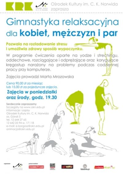 Gimnastyka relaksacyjna pozwala na rozładowanie stresu i umożliwia zdrowy sposób wypoczynku. W programie ćwiczenia oparte na yodze i strechingu, oddechowe, rozcišgajšce i odprężajšce oraz korygujšce kręgosłup narażony na problemy podczas codziennej pracy przy komputerze.
