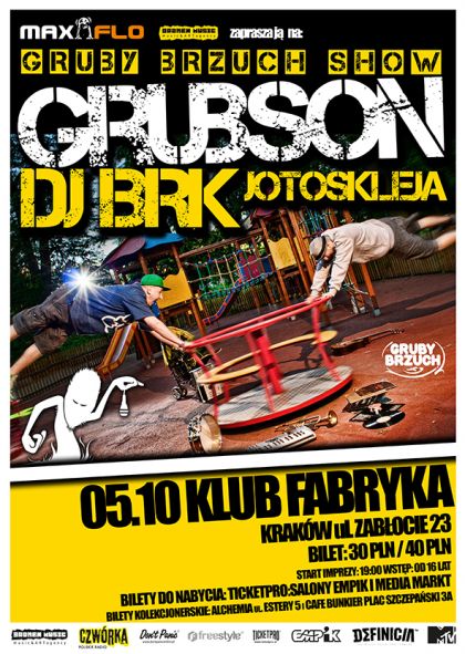 Występ promujšcy wydawnictwo Gruby Brzuch odbędzie się w klubie Fabryka. Płyta, która powstała przy współpracy dwóch charyzmatycznych artystów, jest kolejnym sukcesem GrubSona. Tym razem łšczy on siły z opolskim DJ'em, raperem i producentem BRK, który ma już w dorobku nagrany wspólnie z Jareckim album Mucha nie siada. Gruby Brzuch to pełen pozytywnej energii, zróżnicowany muzycznie materiał, wzbogacony gocinnymi występami artystów wspierajšcych GrubSona podczas koncertów Jareckiego, Bu i Jotosklei.
