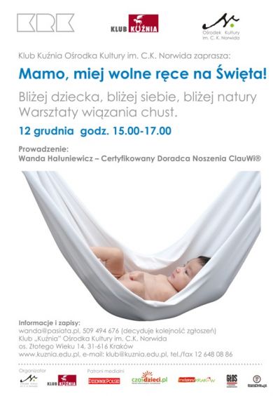 Idš więta! Nadszedł czas porzšdków i przygotowań pieczenia, gotowania, dekorowania domu. Ale jak to zrobić z Maluszkiem na rękach?! Mamy dla Ciebie rozwišzanie uwolnij ręce, naucz się wišzać chustę! Maleństwu daj bliskoć i bezpieczeństwo a sama zajmij się przedwištecznš krzštaninš. To naprawdę działa!
