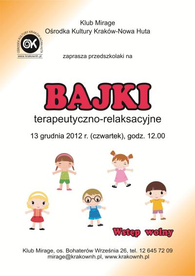 Klub Mirage Orodka Kultury Krakw-Nowa Huta (os. Bohaterw Wrzenia 26) zaprasza 13 grudnia 2012 r. o godz. 12.00 na kolejne bajki terapeutyczno-relaksacyjne.