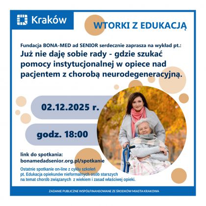 Serdecznie zapraszamy wszystkie osoby opiekujące się osobami starszymi na wykład on-line: Gdy dom to za mało - gdzie szukać pomocy instytucjonalnej w opiece nad pacjentem z demencją, chorobą otępienną, chorobą Alzheimera.