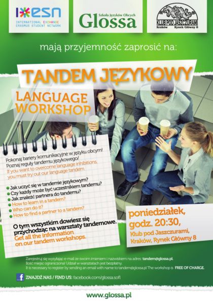 Zapraszamy na warsztaty Tandem Jzykowy ze Szko Glossa! 25.11.o godz. 20:15 - Wicej informacji http://www.glossa.pl/kkj/tandem