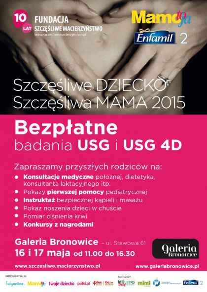 Bezpatne USG i USG 4D, konsultacje medyczne, praktyczne porady i konkursy to wszystko czeka na kobiety w ciy i wieo upieczonych rodzicw w weekend 16 i 17 maja. Galeria Bronowice jest jedynym miejscem w Krakowie, do ktrego zawita akcja Szczliwe dziecko, Szczliwa mama Fundacji Szczliwe Macierzystwo.